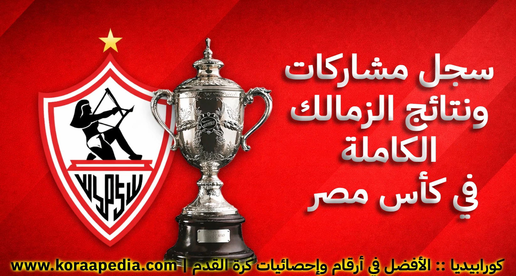في هذا الملف التوثيقي الشامل، تستعرض كورابيديا سجل مشاركات نادي الزمالك في بطولة كأس مصر موسمًا بعد موسم، منذ النسخة الأولى وحتى أحدث مشاركة، مع رصد مسار الفريق في كل نسخة، من الأدوار التمهيدية وحتى المباراة النهائية، مدعومًا بالأرقام والإحصائيات التاريخية، لتقديم خريطة كاملة لمسيرة الزمالك في أقدم بطولات الكرة المصرية.